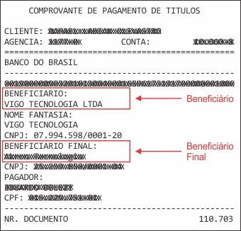 Aparece como beneficiário o nome “Vigo Tecnologia” por sermos o intermediador do pagamento, porém, nos comprovantes de pagamento também existirá a informação do beneficiário final, indicando com total segurança a empresa que irá receber o crédito ao final do processamento.
